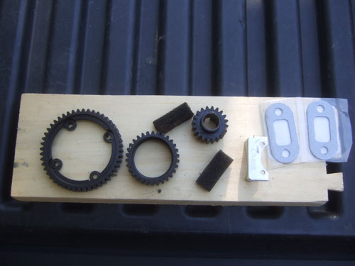 Like always I am a sucker of deals and this time I saw this on hpibajaforum.com a set of heavy duty transmission gears, team chase carb filter and steel reinforced exhaust gasket for $40 shipped. Considering a brand new set of HD gear cost $90 and the Team Chase Carb Diaphragm Filter cost $25, I think this is a pretty good deal.