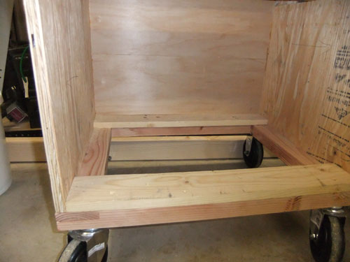 | Here is the base of the table, it is standard dougles fir 2x4 trimmed so the edges are square and not rounded. Then I ran it through the thickness planner to made sure all the pieces are the same. The casters I am using in the picture are from Harbor Freight, they were on sale for $6.99 each. So far I am not too happy with the wheels, when I try to turn I have to put a lot of force to it. |